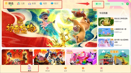 2、首页展示精选与儿歌等分类,设有今日热播推荐栏,可点击分类入口。
