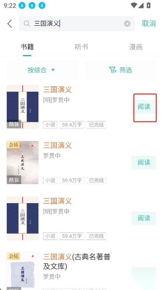 3.根据需求在搜索结果中选择想要的书,点击右边的阅读;