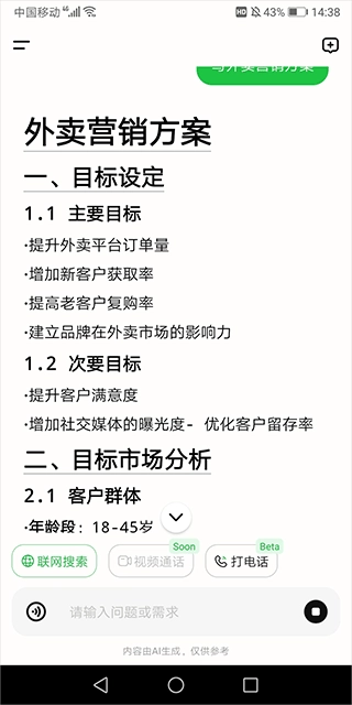 2、借助它撰写外卖营销方案,能够精准契合美团外卖平台,使方案的可行性更高。