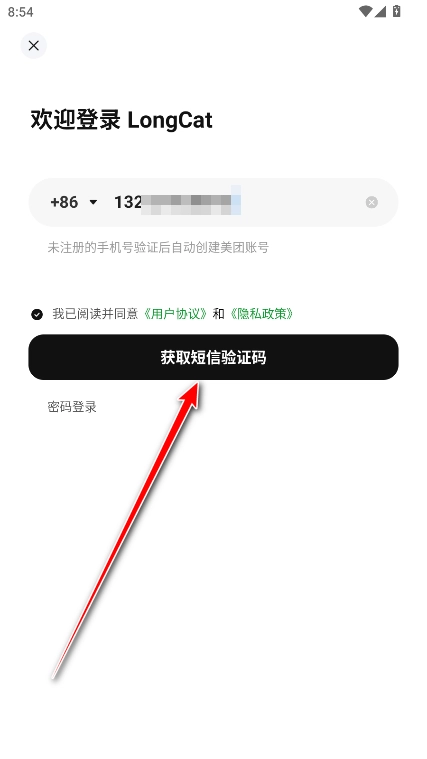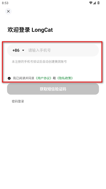 1、打开LongCat,输入手机号,勾选我已阅读并同意《用户协议》和《隐私政策》,这里需要注意的是未注册的手机号验证后自动创建美团账号。