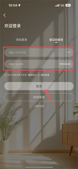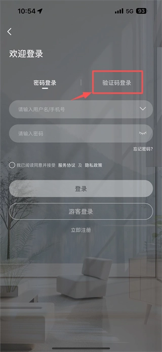 3、在登录页面,点击验证码登录选项,进入验证码登录信息填写页面。