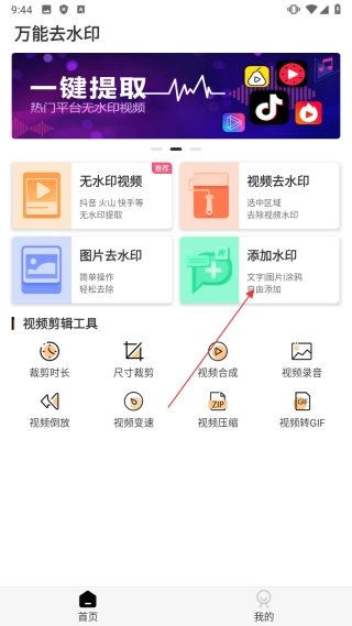 1. 在万能去水印的首页,点击【添加水印】选项,随后便会进入视频选择界面。