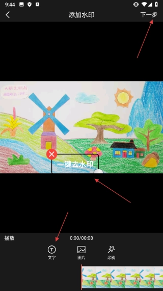 3、在添加水印编辑界面【点击文字添加水印】后,点击【下一步】,进入预览视频界面。