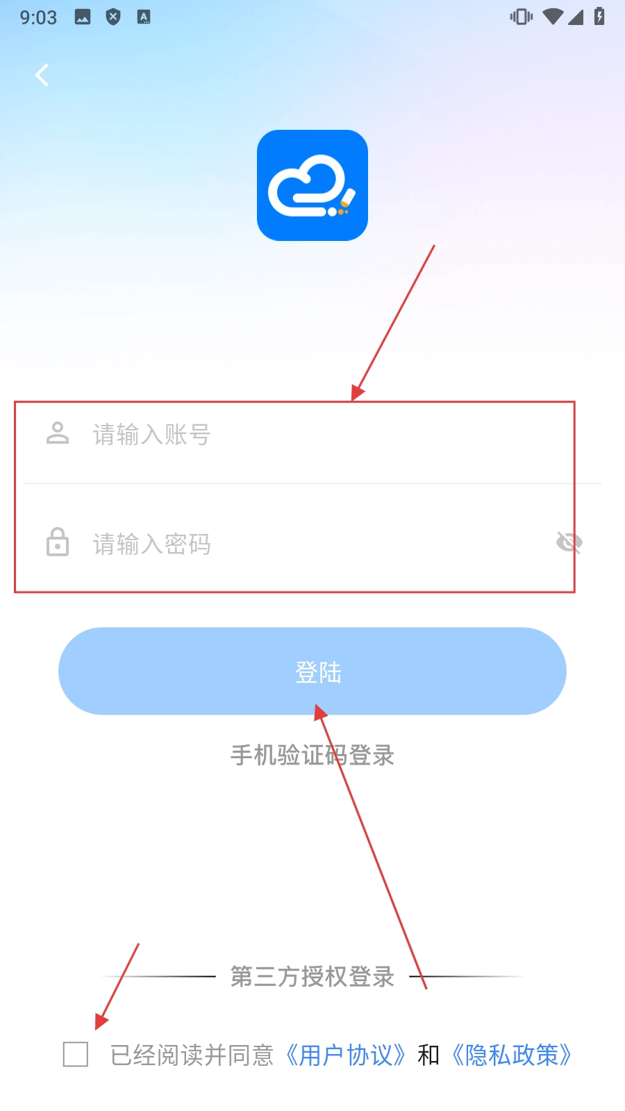 4、在账号密码登录界面,输入【请输入账号和密码,勾选协议】后点击【登陆】,即可完成账号登录。