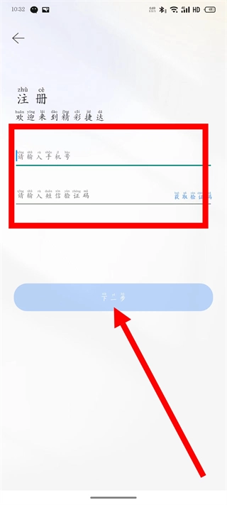 4、输入手机号和验证码后,点击下一步,完成注册登录。