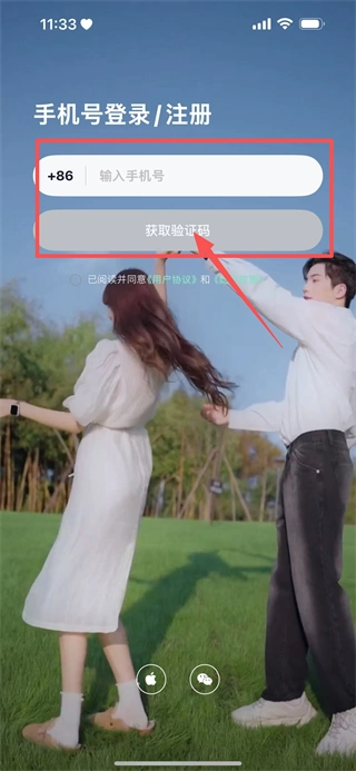 2、在登录注册页面,输入手机号后点击获取验证码,进行下一步。