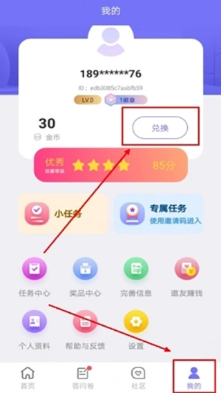 3、在我的界面当中,但是需要点击上方【兑换】选项;