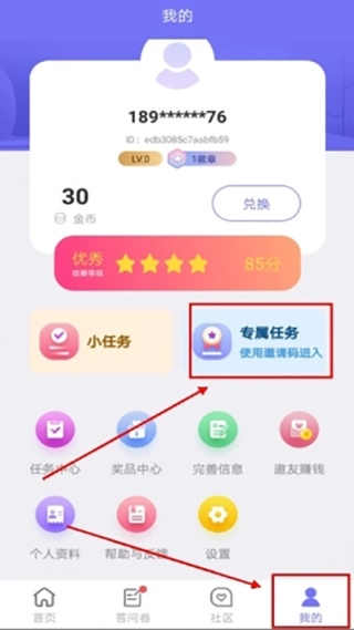 1、首先打开进入右下角【我的】界面,接着找到并点击【专属任务】;
